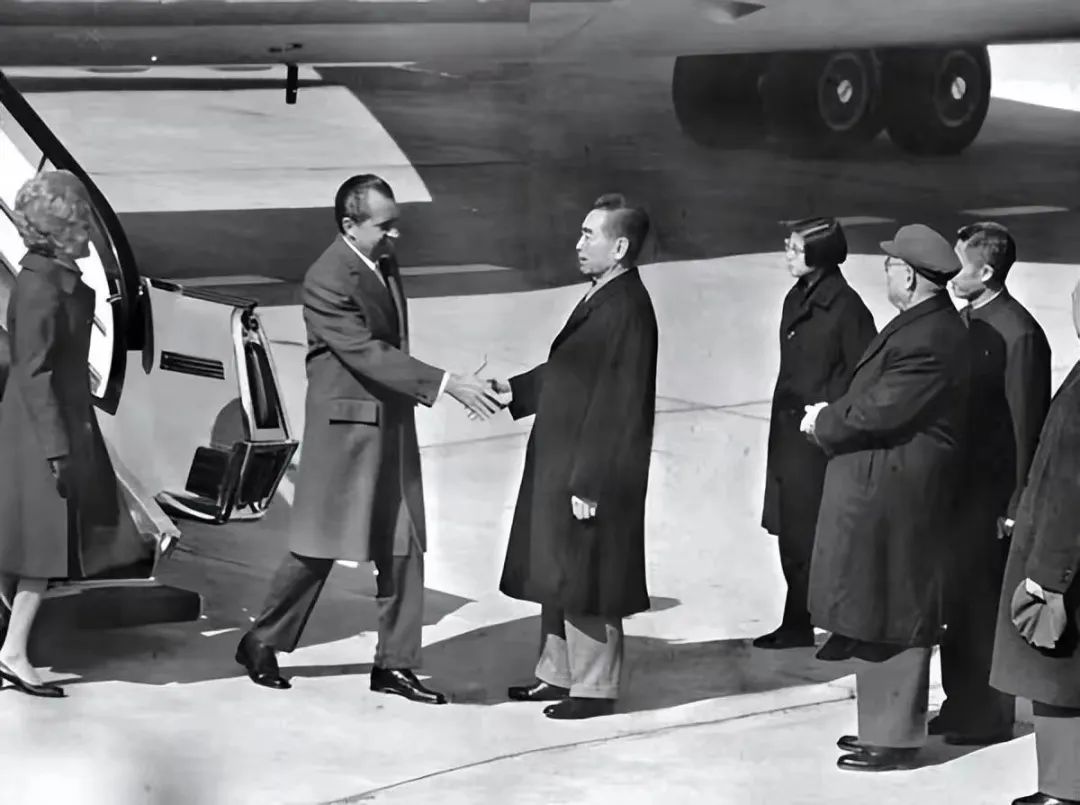 1972年2月21日中午,尼克松总统的专机抵达北京,周恩来等到机场迎接。图为尼克松同周恩来握手。