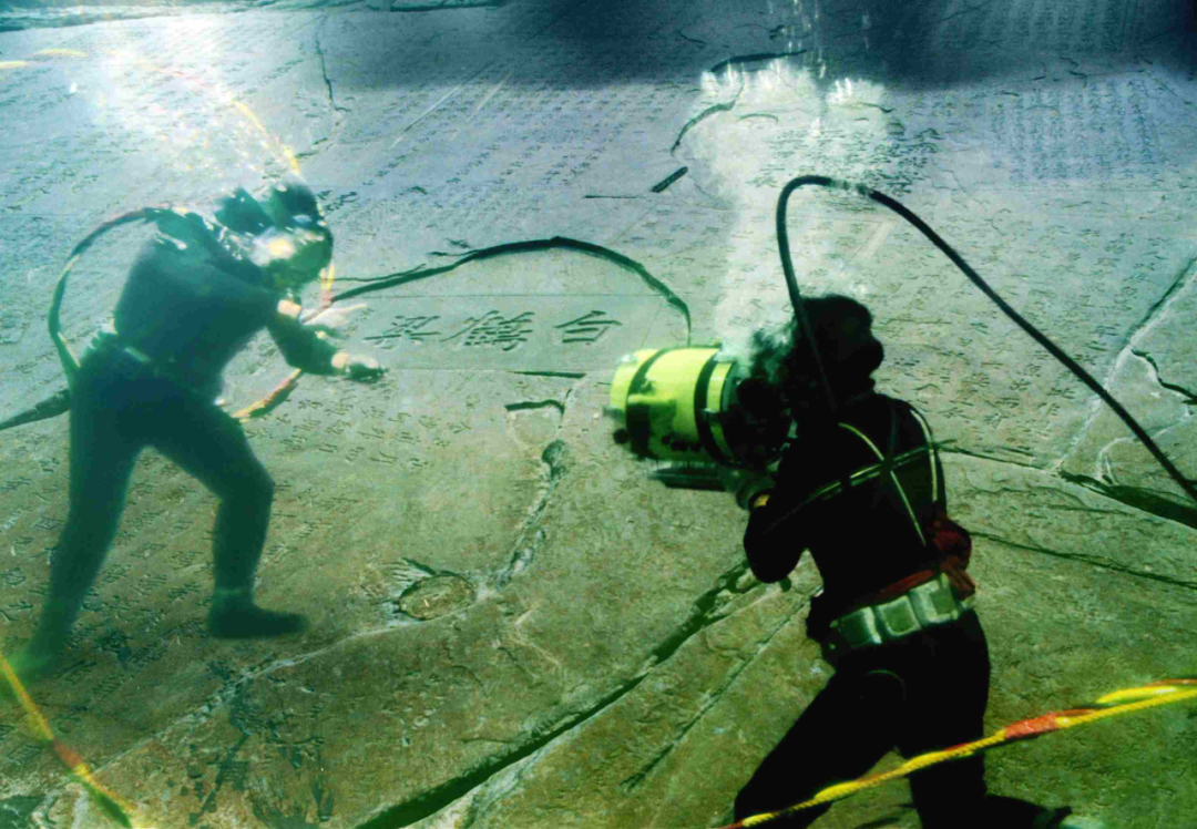 工作人员在白鹤梁题刻水下保护体内潜水作业。