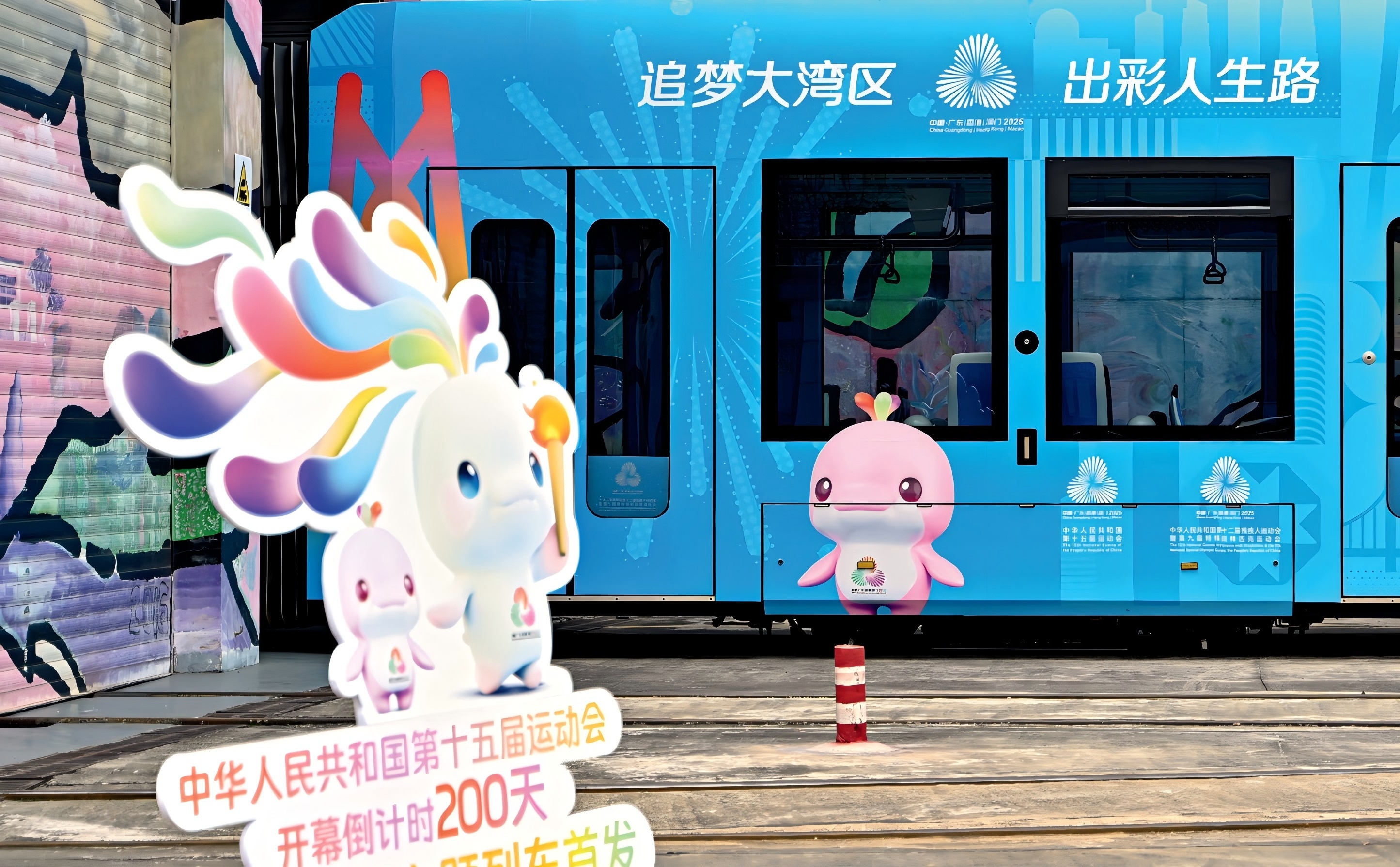 4月23日,在第十五届全国运动会开幕倒计时200天之际,广州地铁“全运号”主题有轨电车正式上线运营。列车车厢外部设计融入港珠澳大桥、广州塔、香港中银大厦、澳门金莲花等地标,内部通过地贴、车窗等载体为乘客打造沉浸式全运会科普空间。中新社记者 陈骥旻/摄