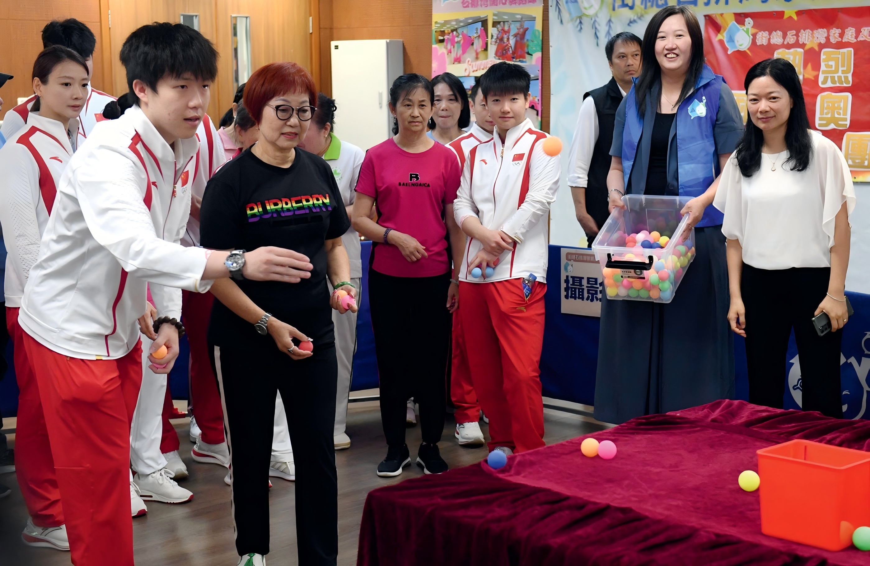 2024年9月2日,内地奥运健儿代表团在澳门进入最后一天的访问行程。当天上午,代表团兵分三路深入社区与澳门居民交流。图为在澳门街坊会联合总会石排湾家庭及小区综合服务中心,乒乓球运动员王楚钦(左)与澳门居民互动“乒乓球投篮”。中新社记者 刘大炜/摄
