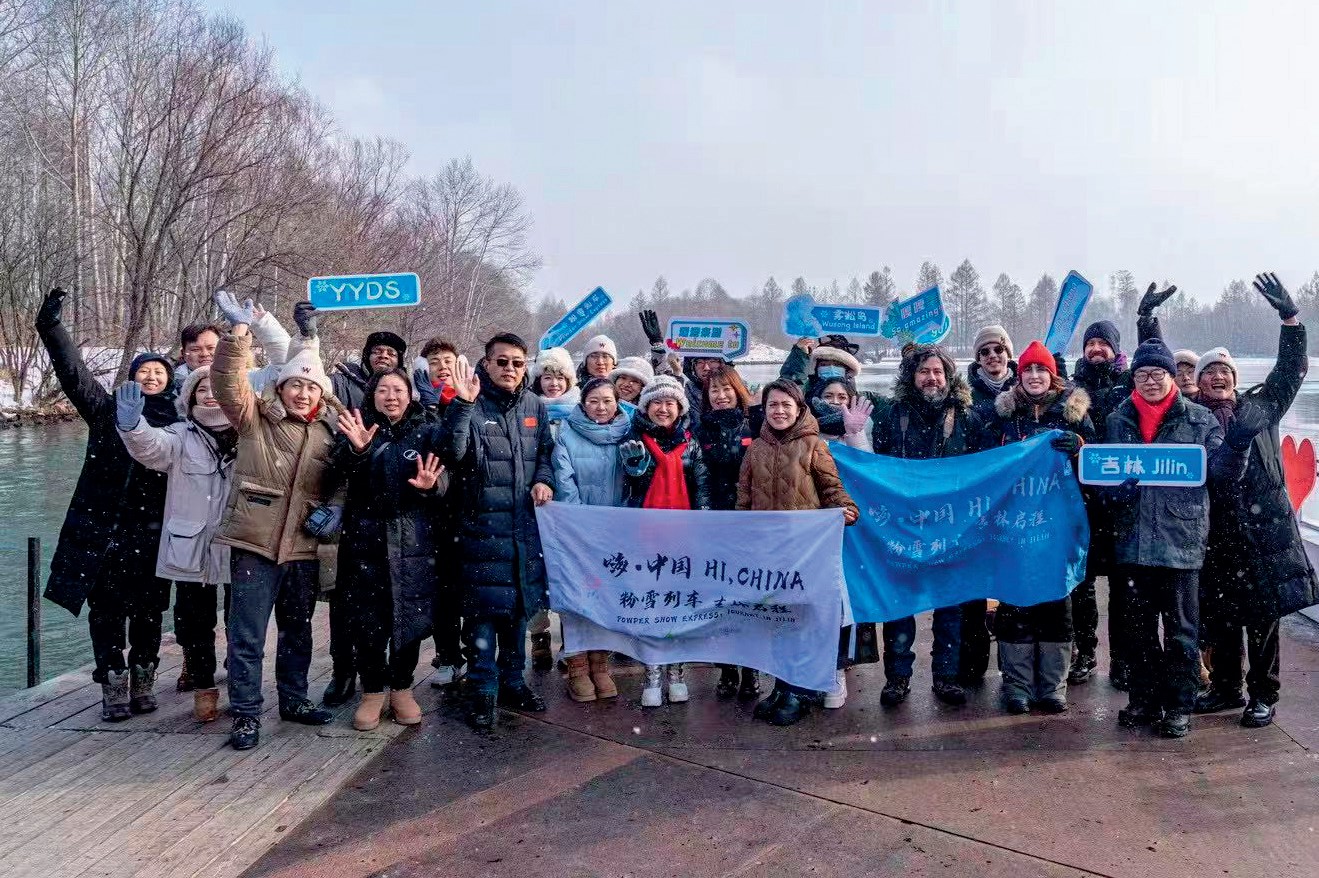 “嗨·中国”吉林行。国际友人与中方团队在雾凇岛合影留念。