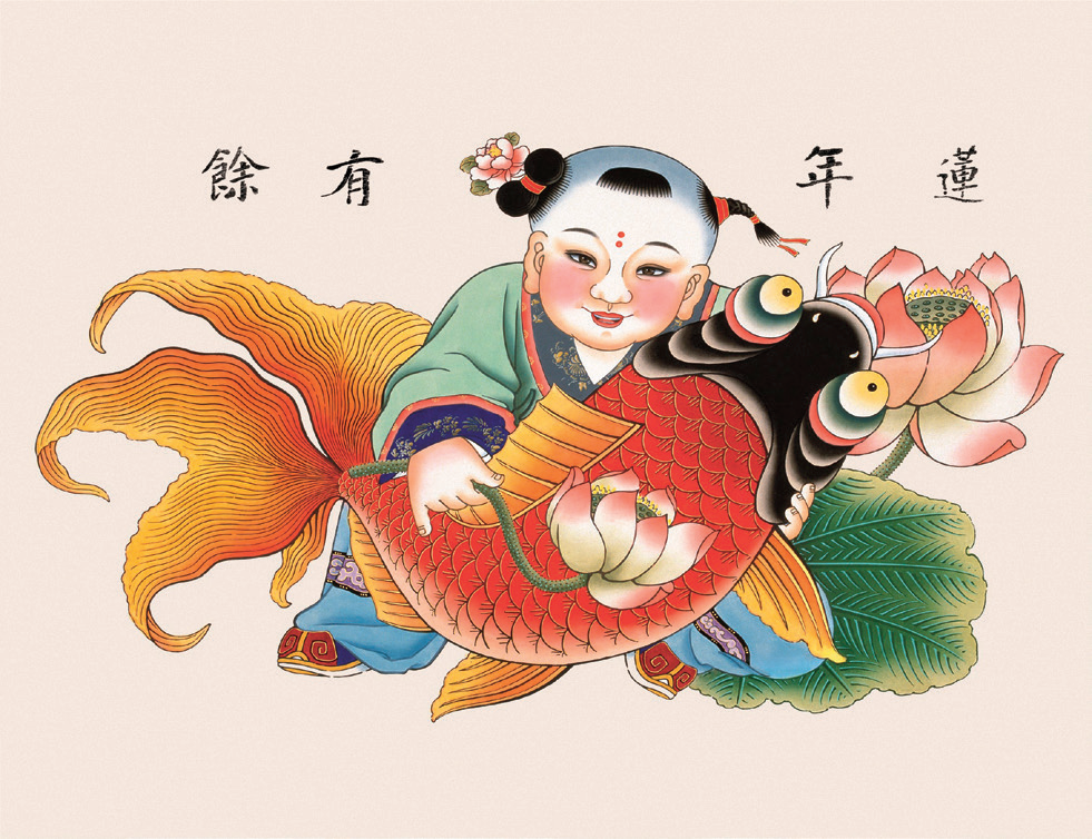 一提到杨柳青年画,人们往往想到的就是《莲年有余》中那怀抱大鱼、人见人爱的大胖娃娃。年画中的“鱼”是“余”的谐音,代表财富有余;“莲”是“连”的谐音,合起来就是“连年有余”,也称“年年有余”,表达了老百姓对美好富足生活的向往。在《莲年有余》的经典构图中,色彩的交响达到极致。红鲤的鳞片用红色层层晕染,仿佛刚从运河里跃出,带着粼粼的水光。娃娃红扑扑的脸蛋透着蜜桃般的绒毛质感,莲叶的翠色从叶脉向边缘渐变,如同晨露在叶面滚动。这些饱和到几乎要滴落的色彩,正是农耕文明对丰收最直白的礼赞。