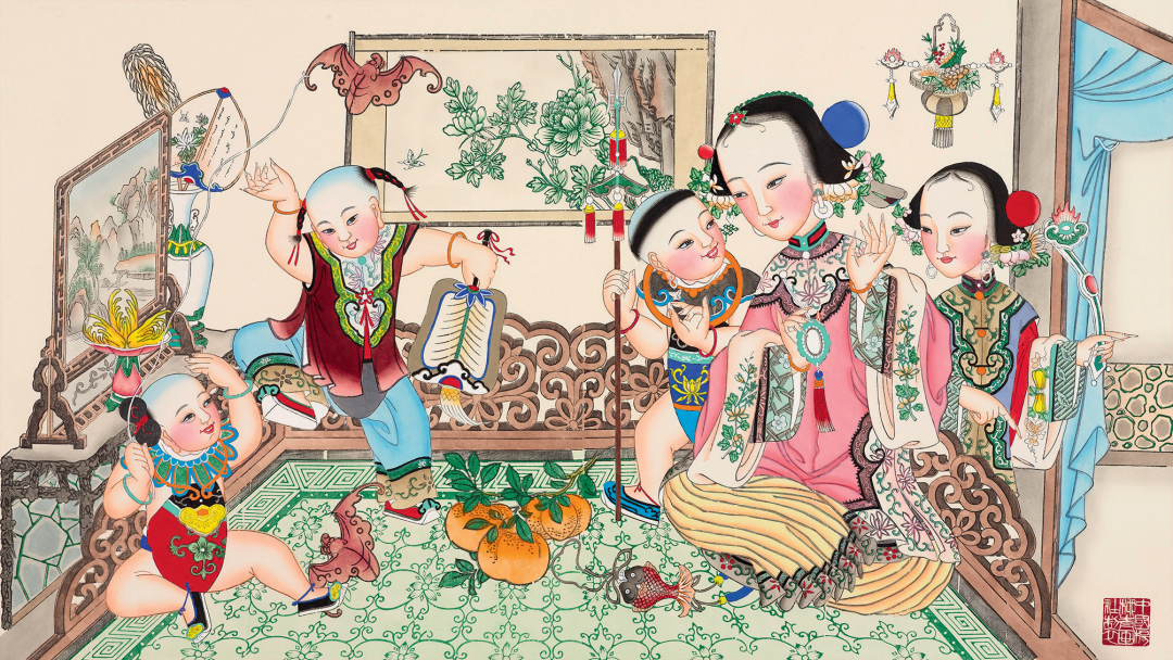 杨柳青年画讲究“图必有意,意必吉祥”,画中的景物承载着美妙情感与独特意象。平安、健康、富裕、成就……这些美好的期冀,往往借助画中的植物、动物、宝物与神兽来传达,含蓄而又浪漫。年画《福寿绵长》中,描绘两名儿童采集瓜果、开心而食的欢乐场景。画面中的果实成熟、硕大多子,借喻岁物丰成、仓箱可期的景象。榴开百子、瓜瓞绵绵,暗喻子孙昌盛、生生不息,与象征长寿的仙桃共同组成福寿绵长的美好祝愿。