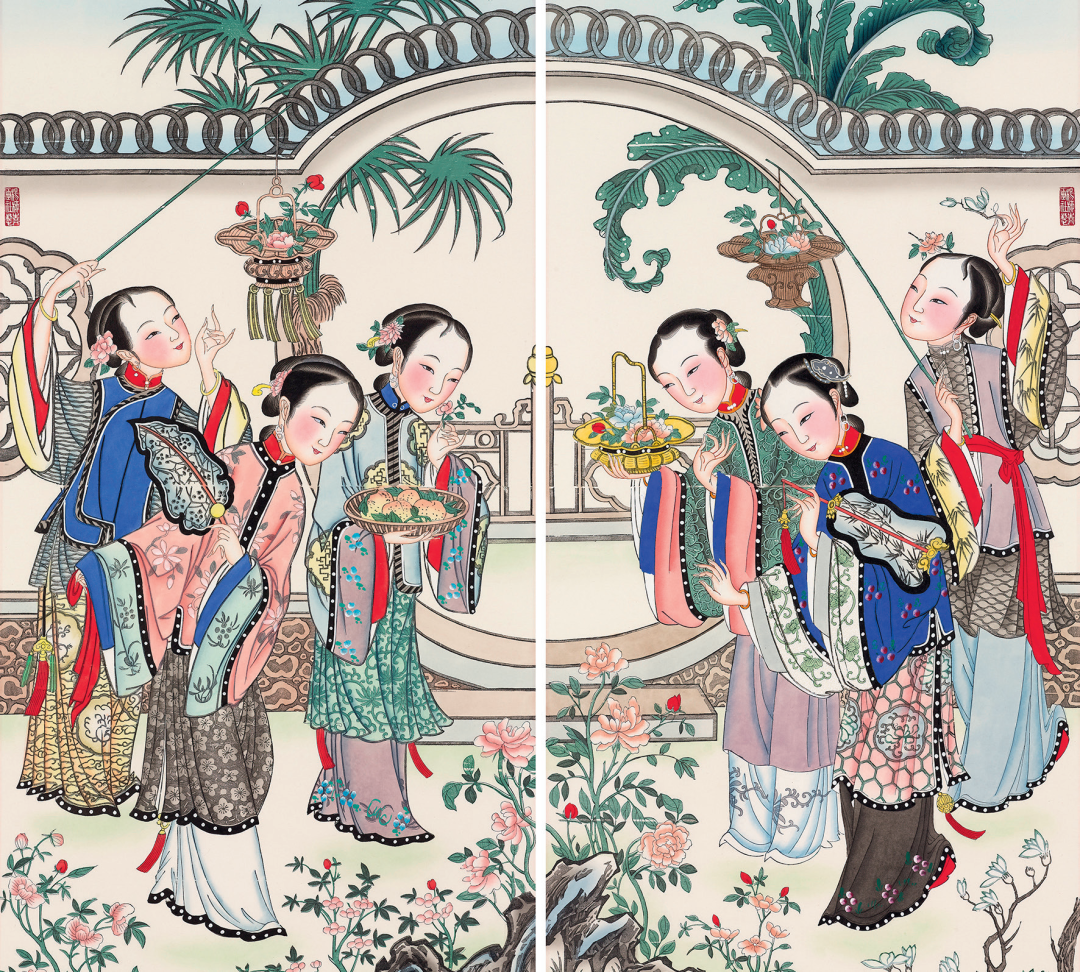 生活中的美被年画画师敏锐捕捉到,并通过独特的视觉语言传递给人们,在潜移默化中完成了传统社会全民性的美育启蒙。年画《仕女游春》描绘了一幅妙龄少女结伴漫步园林的美妙场景。春和景明、草木生发,画中仕女或执团扇回首顾盼,或捧花篮眉目传情,人物面容娇美如出水芙蓉,身姿婉约若柳丝扶风,构图绚丽饱满,呈现出动人的闺阁雅趣。作品以“春天”借喻“青春”,通过对春花春景的描绘抒发对青春年华的赞美,体现了人与自然之间的和谐统一,传达出画师对生命之美的理解与追求。