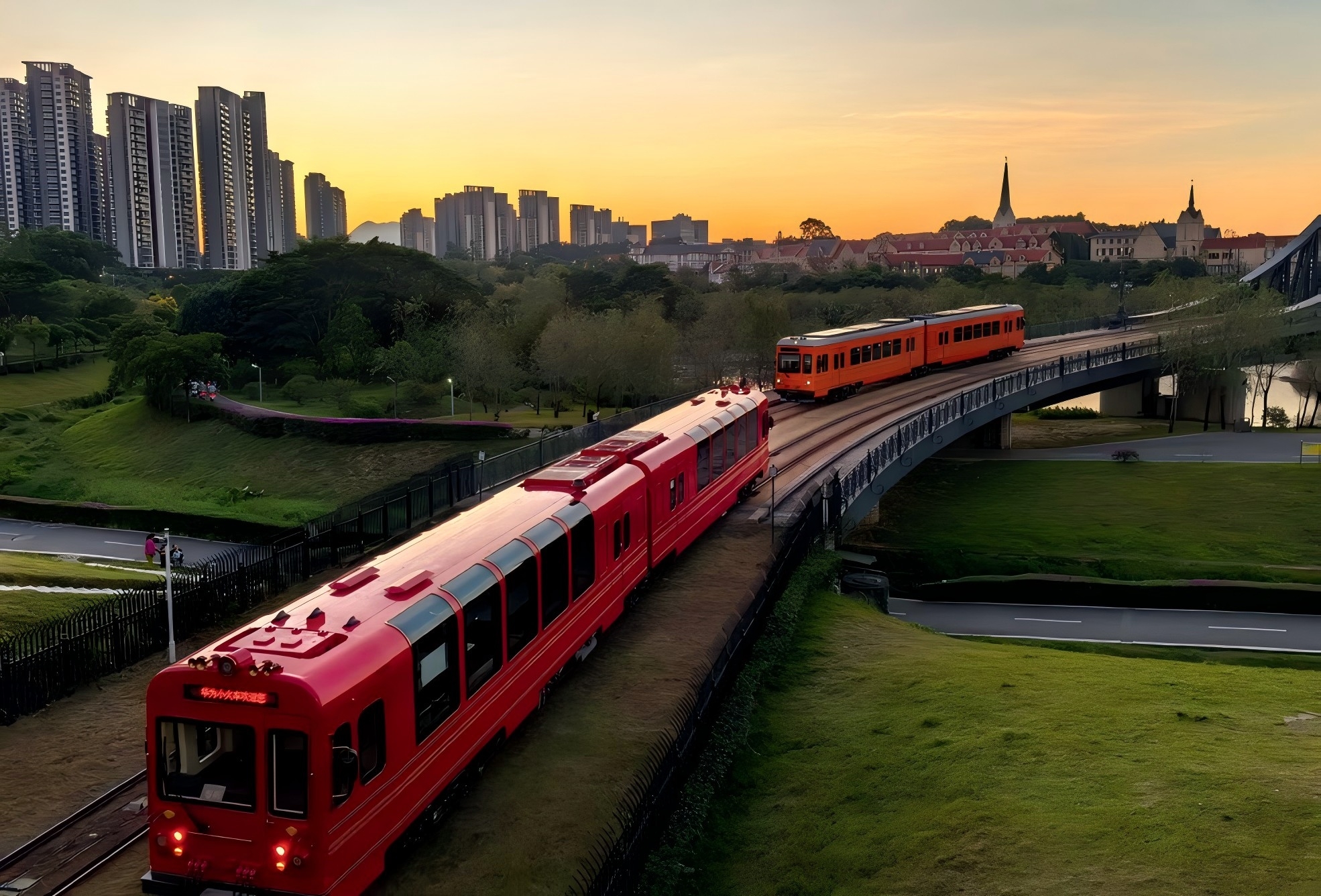 2024年11月28日,广东东莞,华为松山湖基地内接驳人员的小火车在通过园区之间的铁路桥。视觉中国/供图