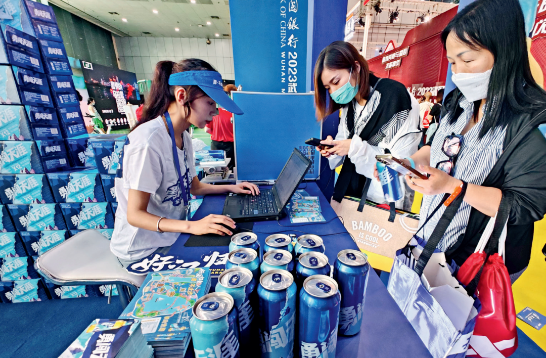 2023年4月13日,2023武汉体育消费周暨武汉体育消费博览会上,长跑爱好者正在领取免费的“勇闯天涯”纪念啤酒。中新社发 李长林/摄