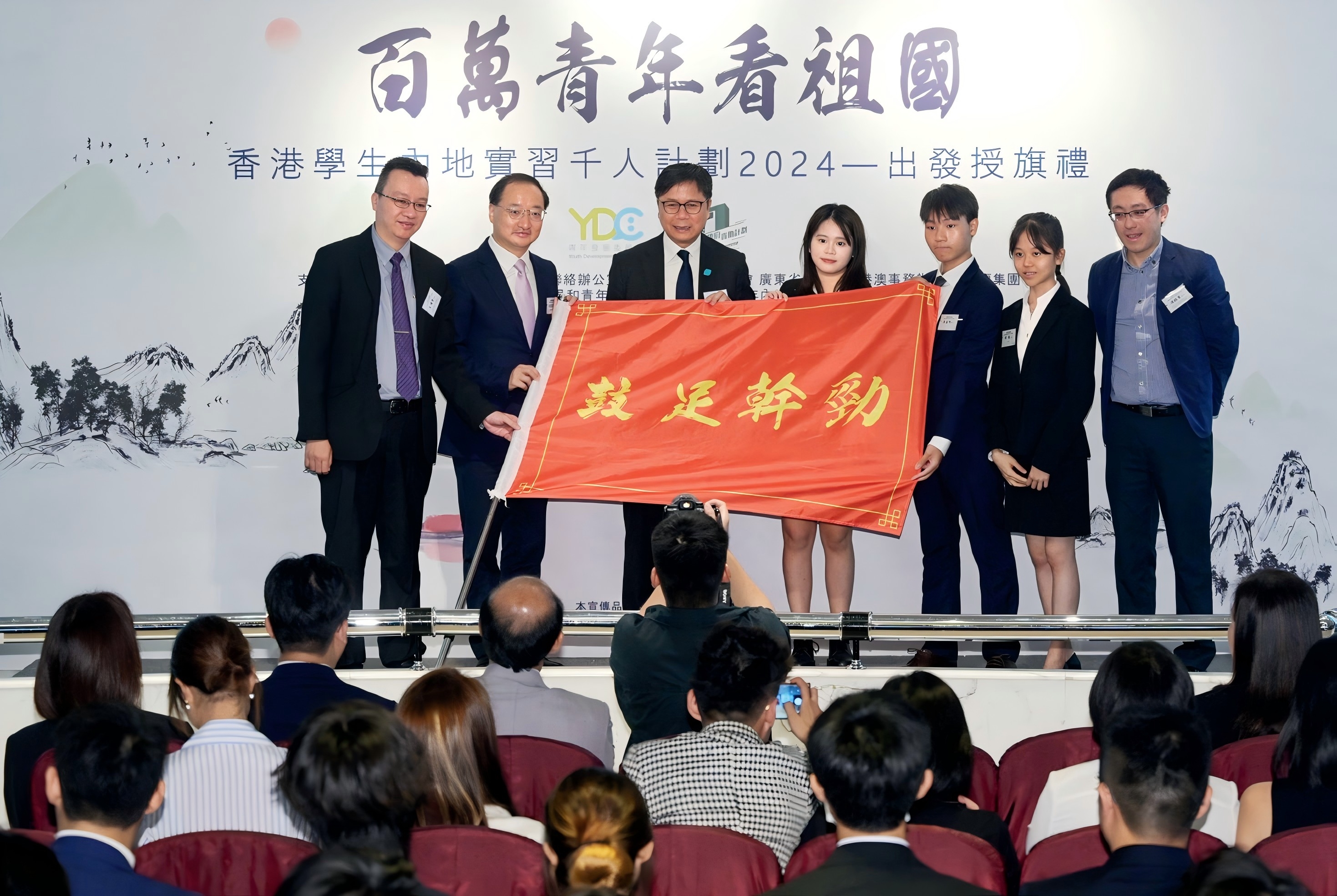 2024年5月27日,“百万青年看祖国——香港学生内地实习千人计划2024”在香港阳明山庄怡景厅举行出发授旗礼,约500名香港学生现场参加。学生将分别到北京、上海、广州、深圳等地进行为期近两个月的实习。图为授旗礼。中新社记者 陈永诺/摄