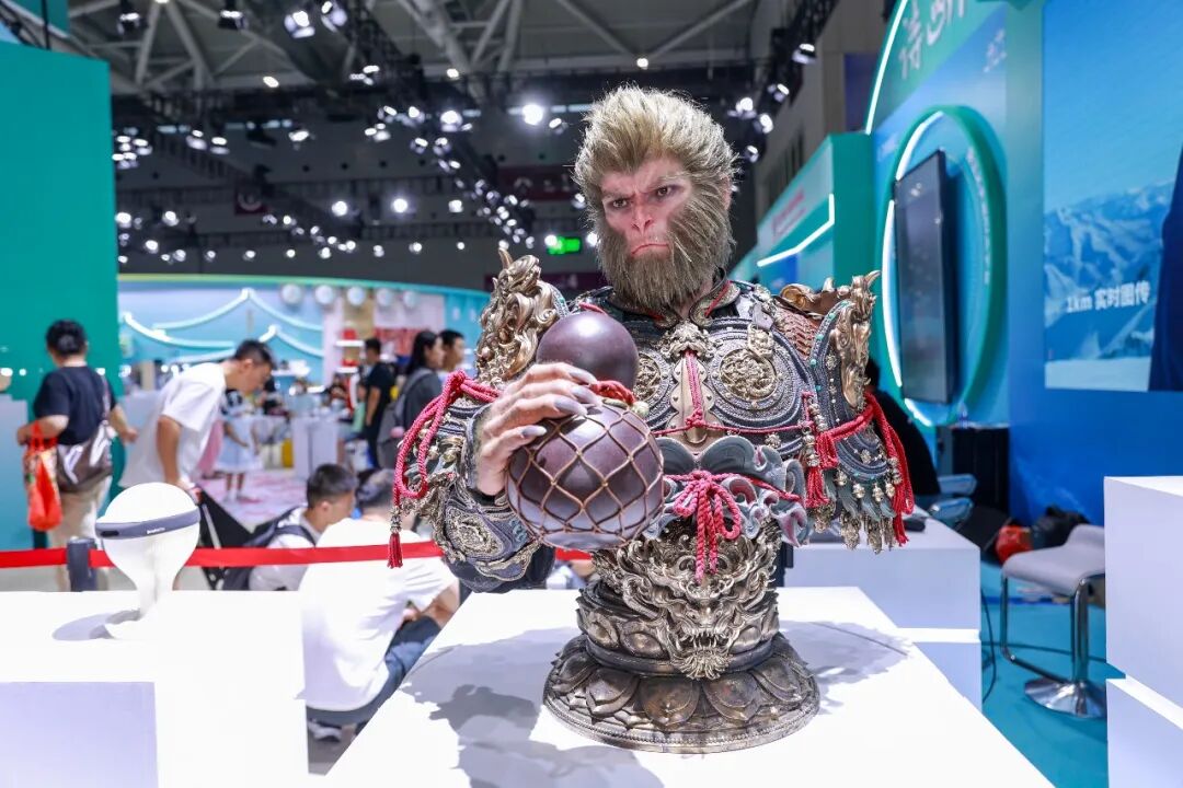 2025年5月22日,第二十一届中国(深圳)国际文化产业博览交易会在深圳开幕。图为观众在深圳文博会上拍摄的黑神话悟空半身像。视觉中国/供图