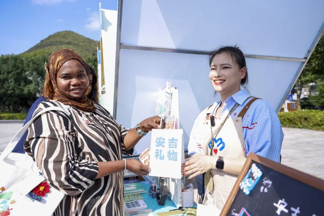 2025年10月15日至18日,部分出席全球妇女峰会的女官员作为发展中国家女政治家研讨班的学员走进浙江开展实践教学,她们分别来自埃及、肯尼亚、尼日利亚等9个国家。图为国际学员接过文创产品。中新社记者 肖健/摄