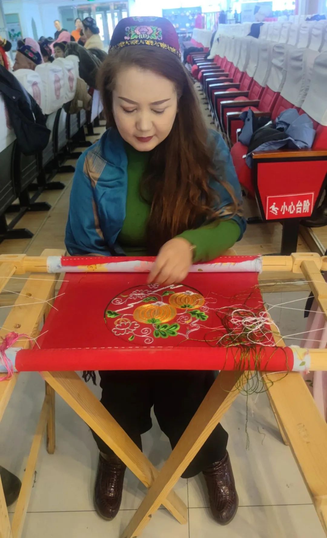 2023年12月14日,哈密非遗中心,哈密市刺绣非遗传承人吐思娜·牙克亚向游客展示刺绣技艺。
