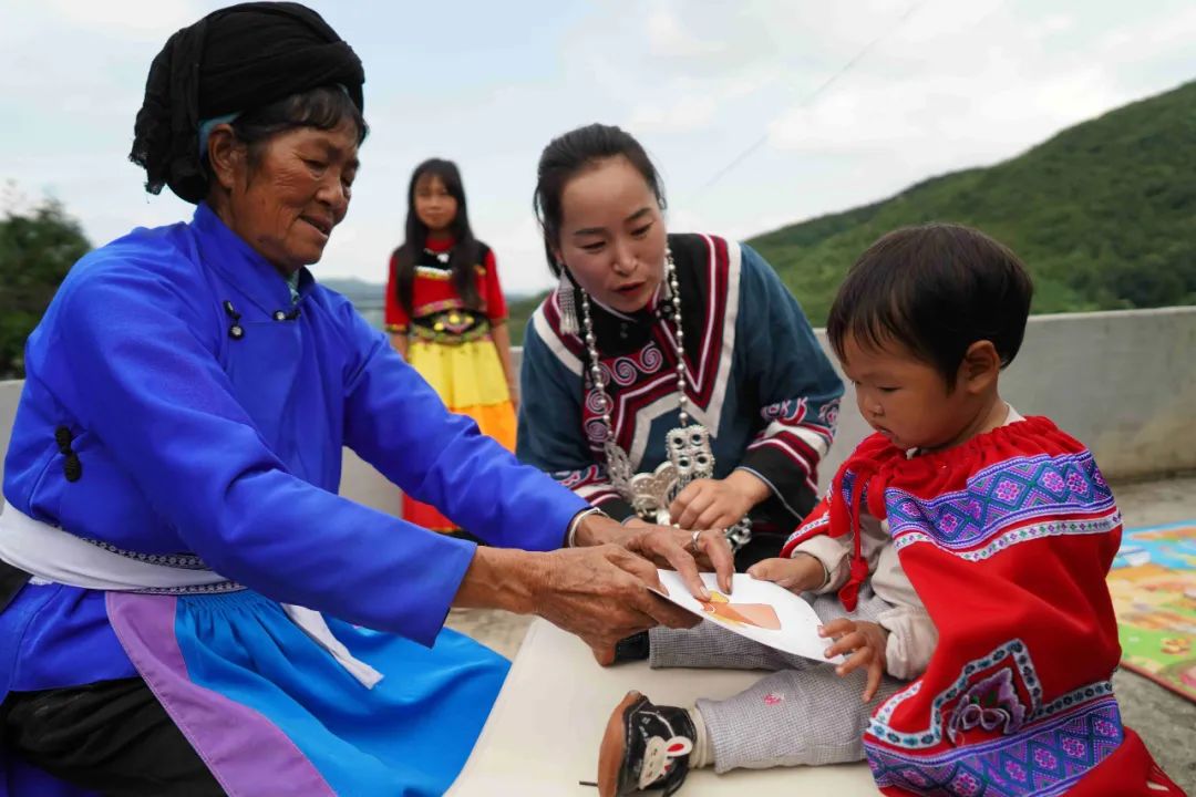 从项目受益者变成项目志愿者,7年多来,孔弟带着各式各样的玩具和绘本,穿梭于不同的家庭。长期给予的陪伴,让孩子们把她视为“另一个妈妈”,这为孔弟带来了强烈的工作自豪感。经过中国发展研究基金会提供的系统化岗前培训和强化培训,她已经可以将国际早教理念转化为方言童谣、山野游戏,让早期干预活动飘散着泥土的芬芳。在开展了一段时间的入户养育指导后,儿童与村民也在悄然发生着变化。曾经怕生的沐沐,如今听到手机播放儿歌便会手舞足蹈;从前只会用本地方言交流的孩子们,现在能用普通话数数、描述形状;连最初对项目效果持怀疑态度的老人们,也开始主动收拾出干净的课桌迎接“孔老师”。