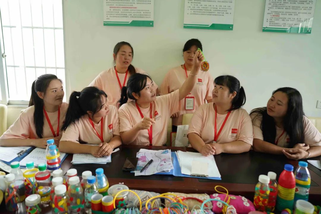 活动结束后,这里又化身成为育婴辅导员的“充电站”:孔弟和同事们围坐在办公桌旁,针对不同月龄段婴幼儿的发展特点,结合入户观察记录开展案例研讨,并用麻绳、玉米皮等乡土材料制作下周入户所需的玩教具。“这个竹编触觉板的纹路设计,可以更好提升孩子的感知能力。”孔弟举着刚完成的教具向同伴讲解。刘碧表示,“通过一周一次的备课,我们可以解决入户时发现的一些问题,提升大家的工作能力。”