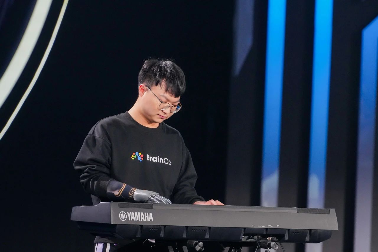 3月29日,浙江强脑科技有限公司仿生手体验官周键在“人机共创·2025AI赋能正能量创作大会”现场使用智能机械手弹奏《大鱼》。中新社记者 陈冠言/摄