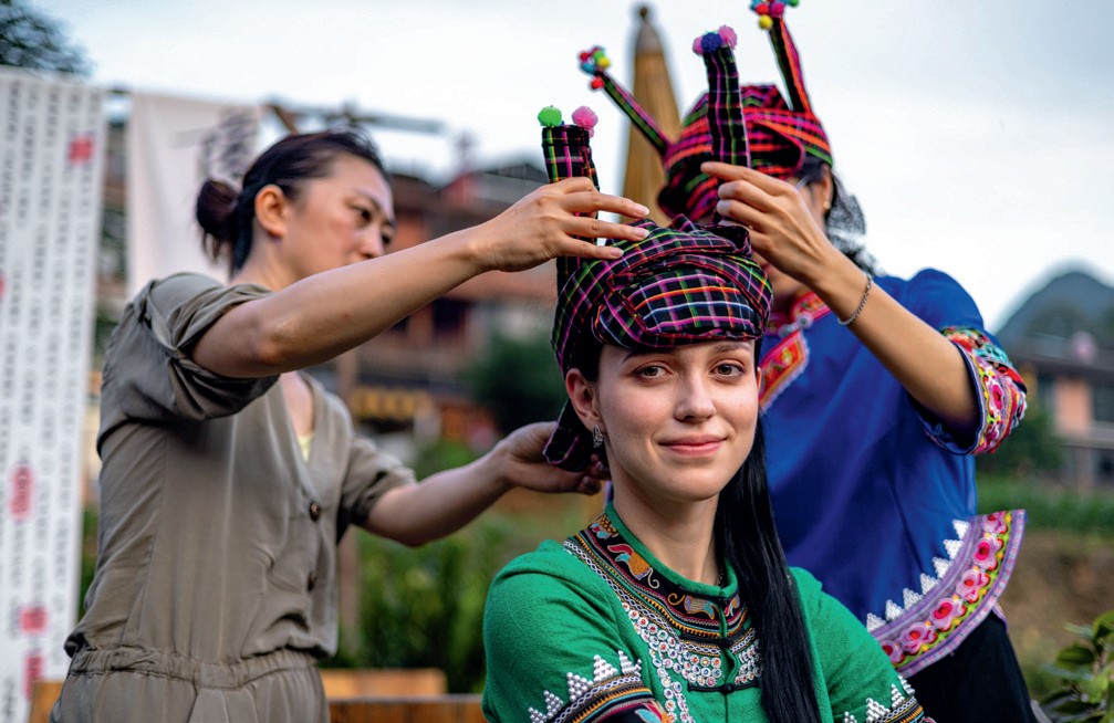 “嗨·中国”云南行。国际友人在“世外桃源”坝美村体验传统服饰。