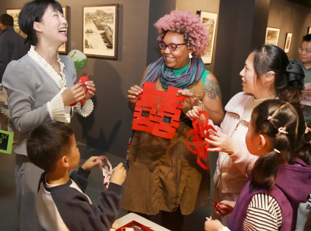 2024年10月27日,江西宜春,来自金砖成员国的国际青年代表在宜春美术馆参加袁州区非遗画展“寻迹•非遗”活动,与市民交流剪纸作品。视觉中国/供图