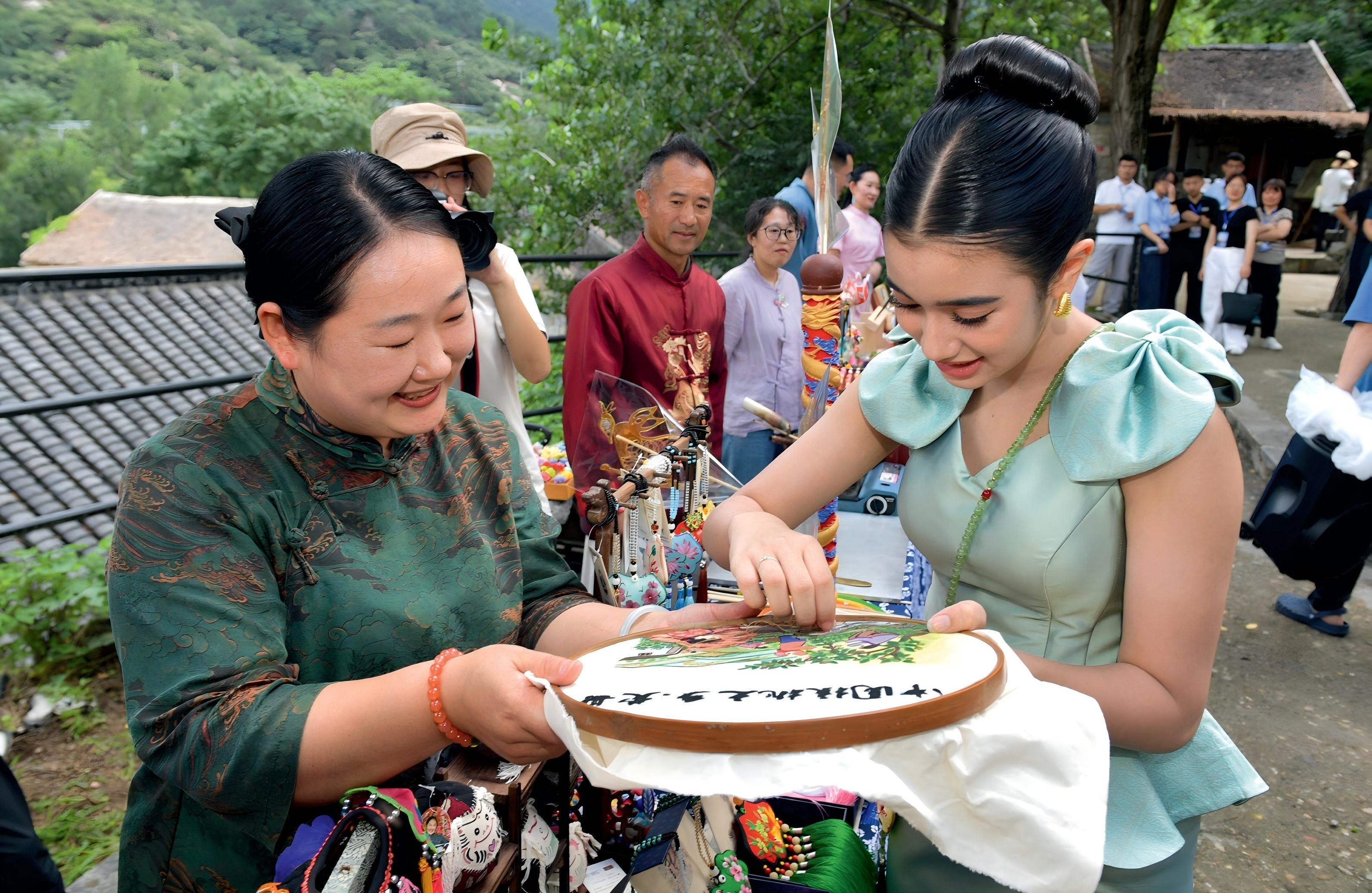 除了剪纸,沂蒙刺绣同样让珍娜公主流连忘返。沂蒙刺绣历史悠久,针法丰富多样,色彩绚丽夺目。绣娘们用手中的针线,在绸缎布料上绣出精美的图案,花鸟鱼虫、人物山水,无一不活灵活现。公主被绣品上细腻的针法和华丽的色彩所折服,她触摸着绣品,对绣娘们的高超技艺赞不绝口。在非遗集市,公主跟着非遗传承人学习绣牡丹,她捏着针的手都有点发抖:“我在家学过柬埔寨的纱笼刺绣,可这针比我们的细多了。”