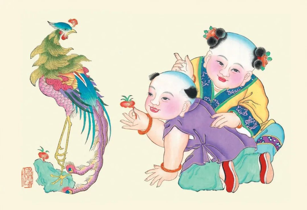 在年画《凤凰来仪》中,彩凤仪态优雅从容,两童子奉瑞草与之亲近,人与禽鸟恬然相安、和谐融洽。凤凰逢盛世而出,是祥瑞的象征,常比拟经世济民的圣贤君子。作品借物喻人,称颂修身律己的君子之道,亦含勉励期许之意。
