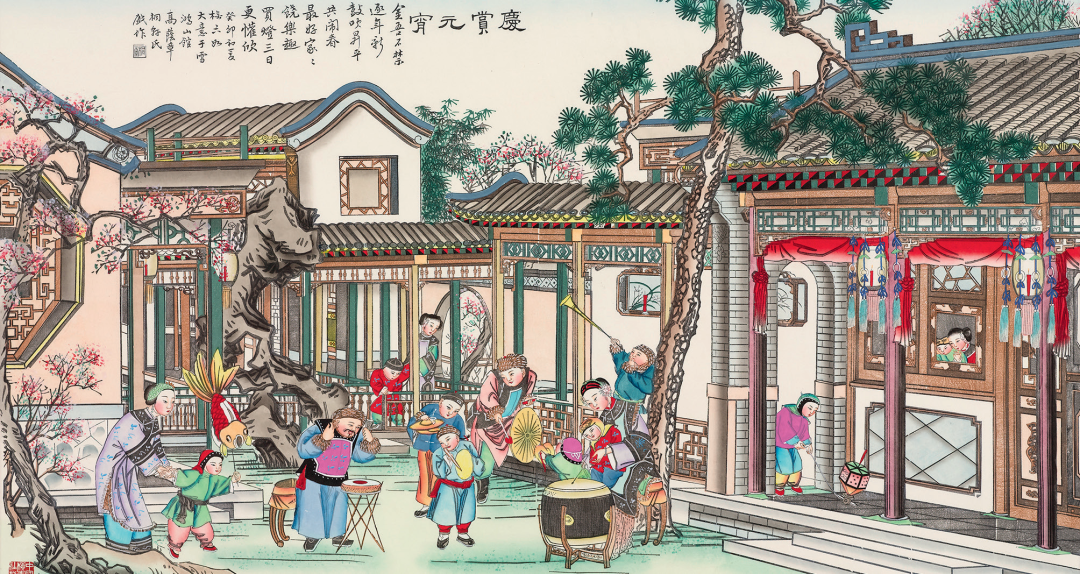 年节意味着团圆与收获,是美好生活的真实体现,对于终日辛勤劳作的人们而言,没有什么能比年节更让人期待了。年画《庆赏元宵》所表现的就是节庆中阖家欢乐的幸福场面。画中的男女老少敲锣打鼓,人人尽情欢奏,共庆元宵佳节,庭院内张灯结彩,凸显烟火繁华的市井气息。作品洋溢着欢乐与活力,完美地捕捉了喜庆祥和的年节气氛。画面上方有画家高桐轩题诗:“金吾不禁逐年新,鼓吹昇平共闹春,最好家家饶乐趣,买灯三日更欢欣。”诗词饱含太平有象、阖家幸福的美好祝愿。
