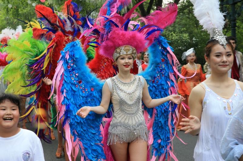 6月28日,黑龙江哈尔滨,太阳岛景区临江街彩绘路上演《遇见·哈尔滨》主题巡游,吸引游客和市民驻足观赏、拍照打卡。中新社发 于琨/摄