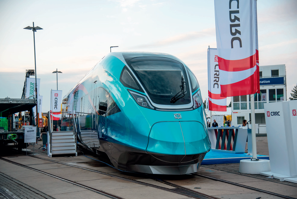 当地时间2024年9月24日,德国柏林国际轨道交通技术博览会开幕,图为中国中车集团展示的城际动车组列车。视觉中国/供图