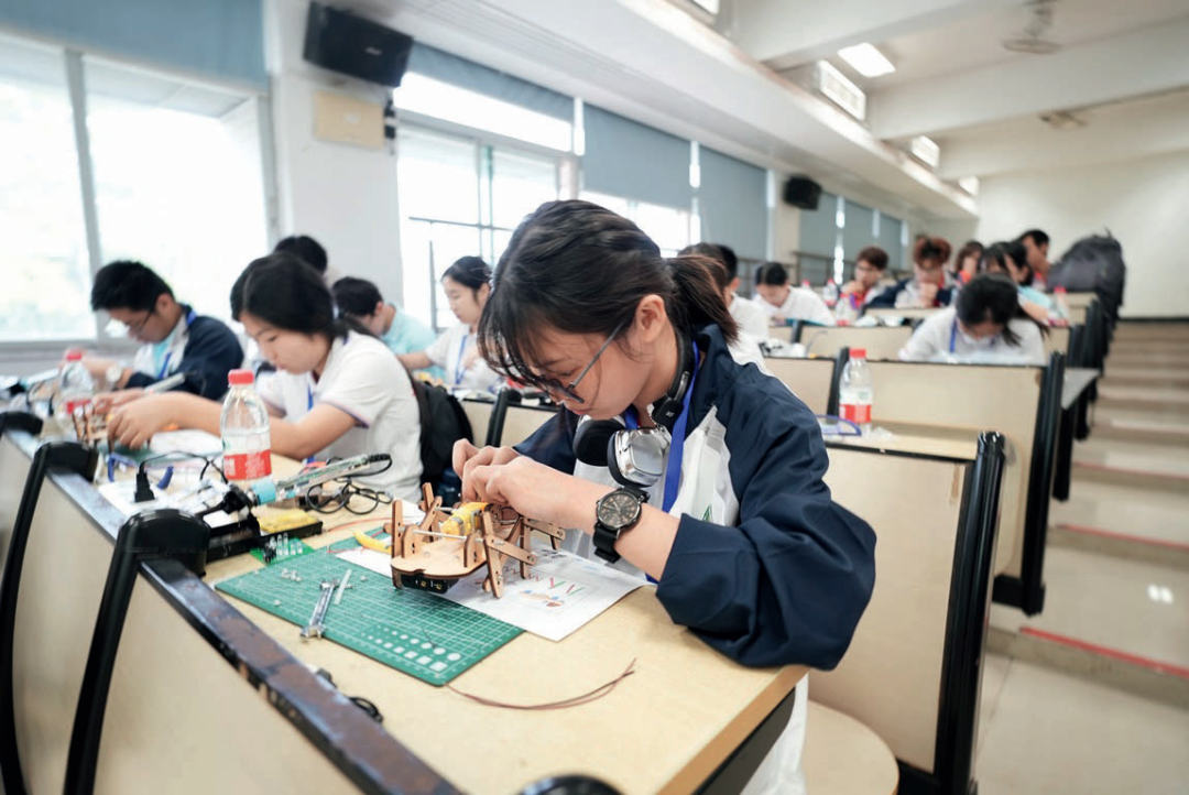 2024年,澳门教青局组织学生到粤港澳大湾区研习,图为学生对六足机器人零件进行装配与电路连接。