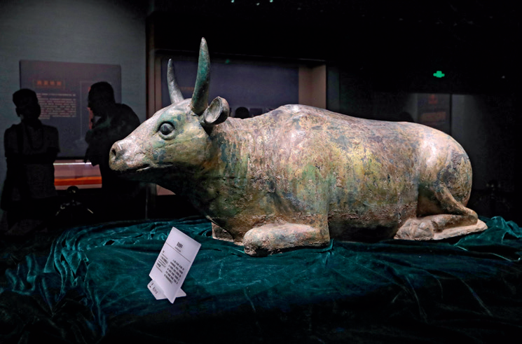 1977年出土于第101号陪葬墓的鎏金铜牛,身长130厘米、宽38厘米,重188公斤,内部空心,外表鎏金,采用中国传统的外范内模浇铸技术制作而成,整体采用雕塑、铸造、鎏金、焊接、抛光等工艺。其造型生动逼真,工艺精湛绝伦,不仅代表了西夏时期高超的金属冶炼和铸造技术,更见证了当时农耕经济的繁荣,以及各民族间的技术交流与文化融合。