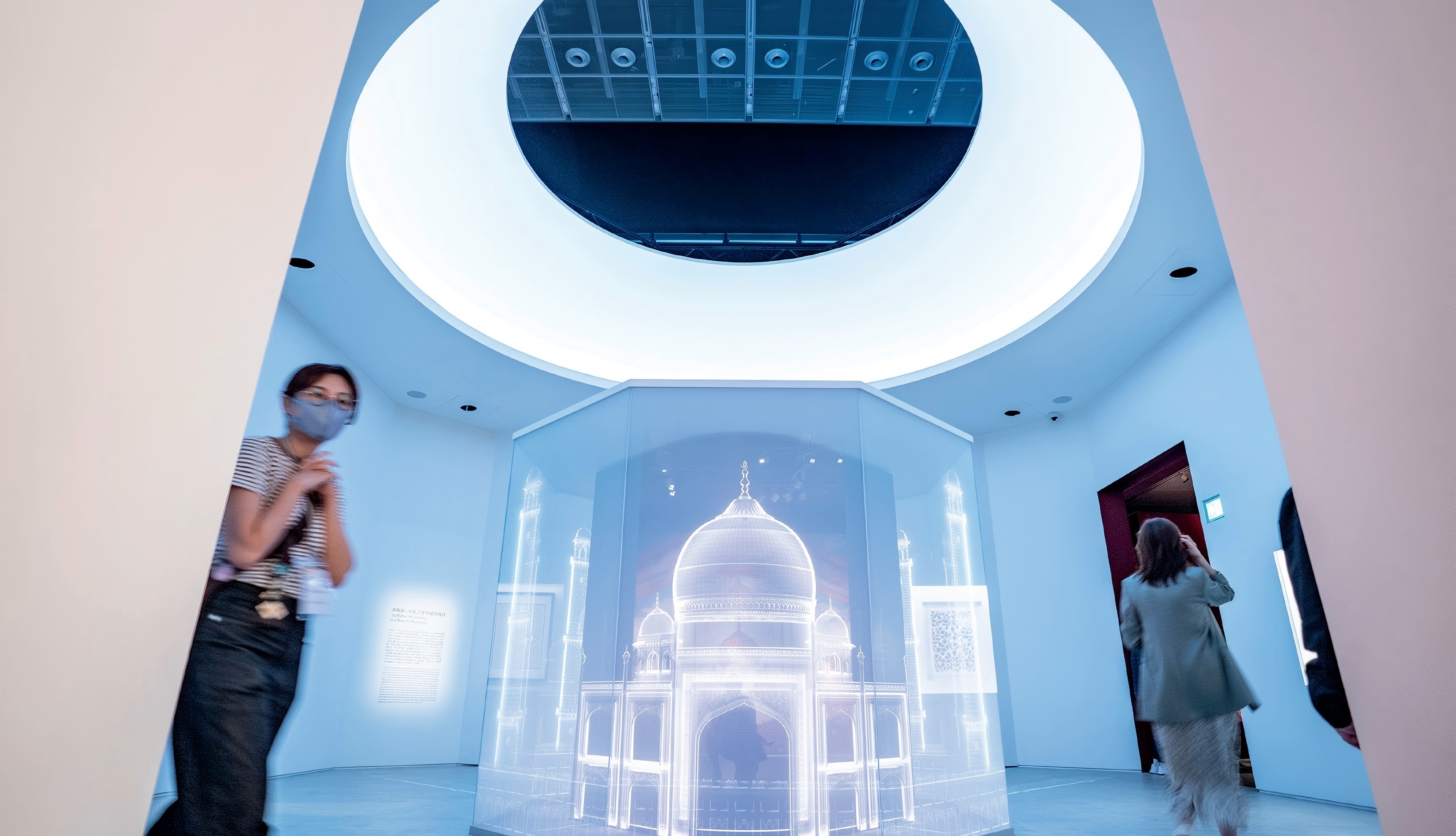 8月6日,香港首个全面展示莫卧儿王朝艺术的特别展览“莫卧儿王朝瑰宝——英国维多利亚与阿尔伯特博物馆珍藏”在香港故宫文化博物馆向公众开放。图为配合此次展览推出的多媒体项目“泰姬陵:永恒之爱与建筑瑰宝”。中新社记者 侯宇/摄
